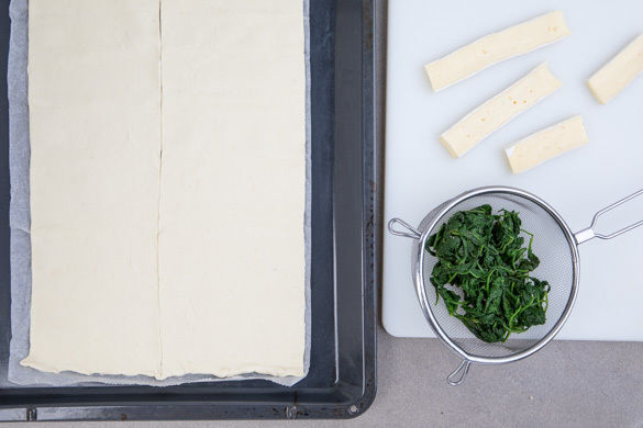 ⅔ des Spinats in ein Sieb geben und mit dem kochenden Wasser übergießen. Sofort mit kaltem Wasser abspülen und so viel Flüssigkeit wie möglich auspressen. Den Rand des Bries dünn abschneiden und den Brie in feine Scheiben schneiden. Den Teig mit dem Papier nach unten auf einem Backblech ausrollen und längs halbieren.