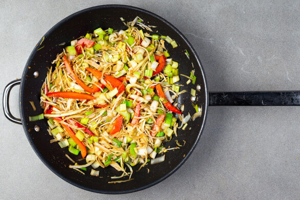 Das Gemüse und die restliche Knoblauch-Ingwer-Paste in der Pfanne mit 1EL Pflanzenöl bei mittlerer bis starker Hitze 2–3Min. braten. Mit der Würzsauce ablöschen, 1–2Min. braten, mit Salz und Limettensaft abschmecken. Die Tortillas mit Gemüse, Tofu, Koriander und Erdnüssen füllen. Mit der Sweet-Chili-Mayo beträufeln und mit den Limettenspalten servieren.