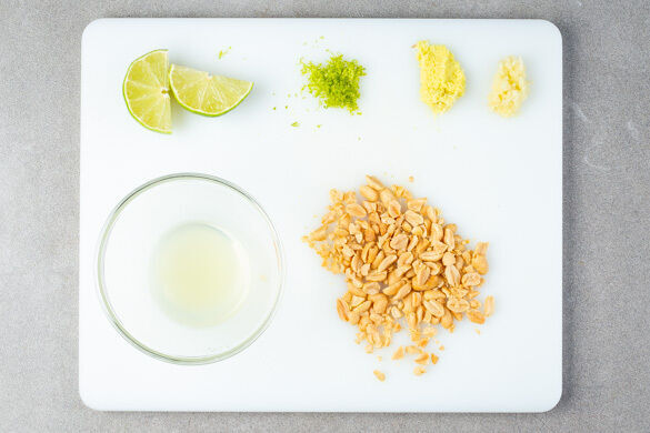 Die Limettenschale abreiben und die Limette halbieren, eine Hälfte auspressen, die andere Hälfte in Spalten schneiden. Die Erdnüsse grob hacken.