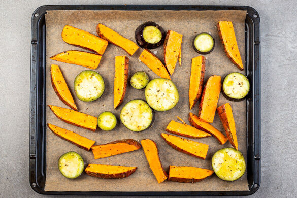 Den Backofen auf 240°C (220°C Umluft) vorheizen. Die Süßkartoffeln samt Schale in 1–2cm dicke Stifte oder Spalten schneiden. Die Aubergine in ca. 2cm dicke Scheiben schneiden, ggf. vorher längs halbieren.