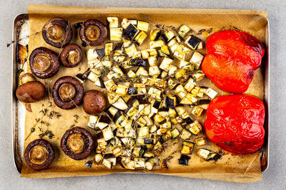 Den Backofen auf 240°C (220ºC Umluft) vorheizen. Die Aubergine in ca. 2cm große Würfel schneiden. Die Pilze ggf. säubern und mit den Auberginen und dem Thymian auf ein mit Backpapier ausgelegtes Backblech geben. Die Paprika halbieren, entkernen und mit der Schnittfläche nach unten auf das Blech legen. Den Knoblauch samt Schale unter die Paprika legen.