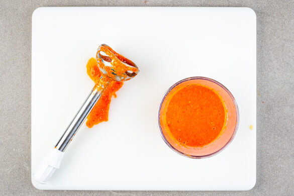 Die Zwiebelviertel, den Ingwer, die Chiliwürfel, 2EL Olivenöl und 2EL Wasser zu der Paprika und dem Knoblauch in das hohe Gefäß geben und mit einem Stabmixer grob pürieren. Die Sauce mit Salz abschmecken. Tipp: Wer es gar nicht scharf mag, kann die Chili auch weglassen.