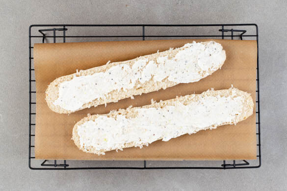 Die Brötchen längs aufschneiden. Den Knoblauch schälen und sehr fein würfeln oder durch eine Knoblauchpresse drücken, dann mit 4EL veganer Mayonnaise und je 1 kräftigen Prise Salz und Pfeffer verrühren. Die Brötchen auf ein mit Backpapier ausgelegtes Backblech legen und mit der Knoblauchmayo bestreichen. Im Ofen 8–9Min. backen, bis das Brot goldbraun und knusprig ist.