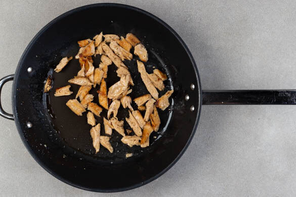 Die veganen Hähnchenschnetzel in mundgerechte Stücke zerkleinern und in einer großen Pfanne mit 2EL Pflanzenöl bei mittlerer Hitze in 5–6Min. goldbraun anbraten. Die Schnetzel mit je 1 kräftigen Prise Salz und Pfeffer würzen.