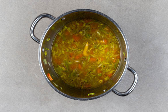 Das Brühgewürz und die Gewürzmischung mit 1,2L warmem Wasser hinzufügen und aufkochen lassen. Die Suppe 13–15Min. köcheln lassen, bis das Gemüse gar ist.