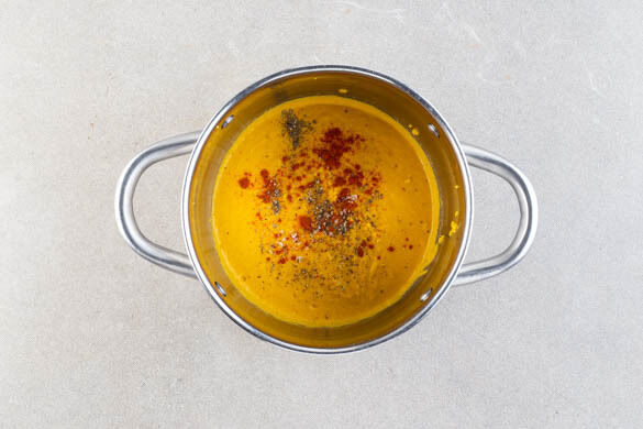 Die Karotten-Cashew-Mischung mit einem Stabmixer im Topf cremig pürieren. Mit den Hefeflocken, dem restlichen Paprikapulver nach Geschmack sowie Salz und Pfeffer würzen.