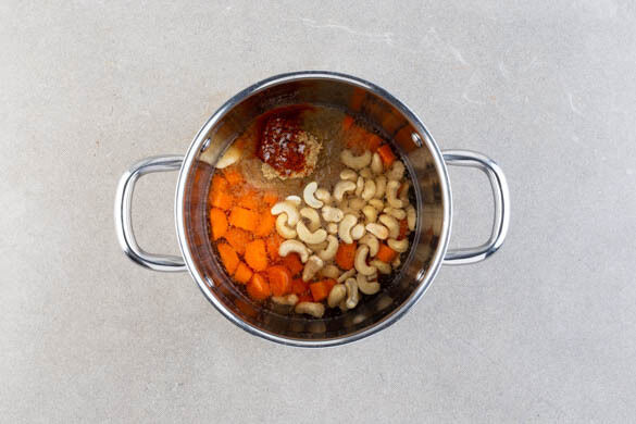 Den Backofen auf 210°C (190°C Umluft) vorheizen. Die Karotte ggf. schälen, längs halbieren und in 1cm große Stücke schneiden. Den Knoblauch schälen. Die Karotten, den Knoblauch, die Cashews, ½TL Paprikapulver und 1 kräftige Prise Salz in einem kleinen Topf in 200ml Wasser aufkochen und bei mittlerer Hitze 5–7Min. köcheln, bis die Karotten weich sind.