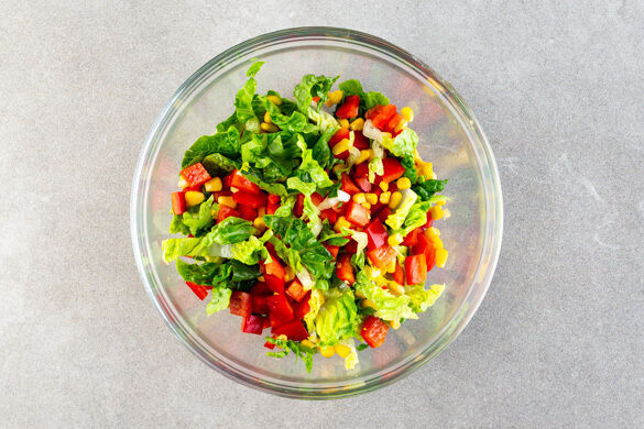 Den Salat in mundgerechte Stücke oder Streifen schneiden. Die Paprika halbieren, entkernen und in ca. 1cm kleine Würfel schneiden. Aus 1EL Olivenöl, 1EL Essig sowie je 1 Prise Zucker, Salz, Pfeffer ein Dressing anrühren und mit dem Salat, der Paprika und dem restlichen Mais vermengen.