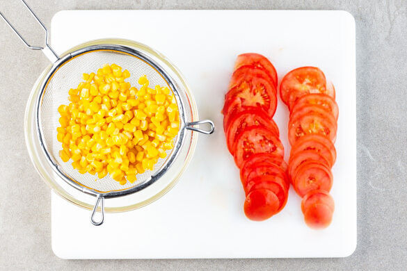 Inzwischen den Mais in ein Sieb abgießen. Die Tomaten in dünne Scheiben schneiden.