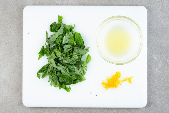 Das Basilikum samt Stängeln grob schneiden. Die Zitronenschale fein abreiben, dann die Zitrone halbieren und auspressen.