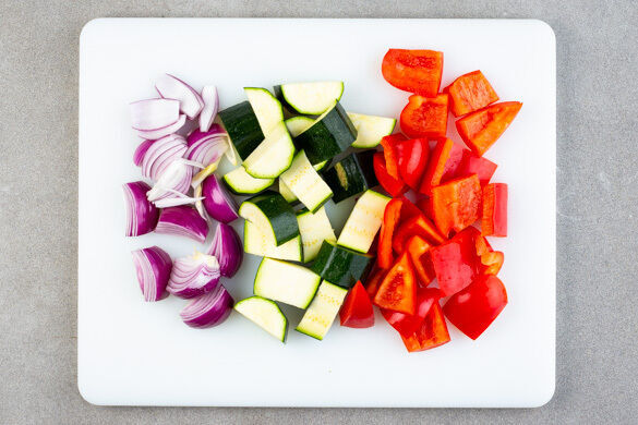Den Backofen auf 200°C (180°C Umluft) vorheizen. Die Paprika vierteln, entkernen und in ca. 3cm große Stücke schneiden. Die Zucchini längs halbieren und ebenfalls in ca. 3cm große Stücke schneiden. Die Zwiebel schälen, halbieren und in dicke Spalten schneiden.