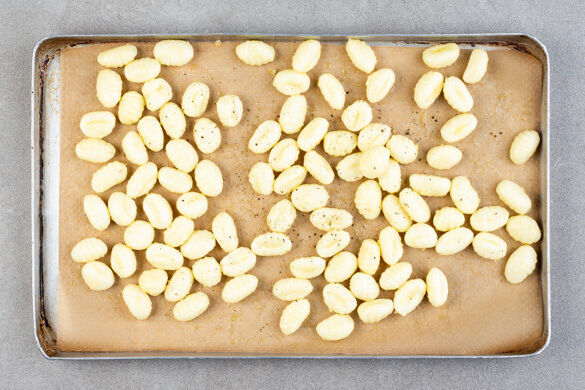 Die Gnocchi mit 1EL Olivenöl sowie je 1 kräftigen Prise Salz und Pfeffer vermengen und auf einem zweiten mit Backpapier ausgelegten Backblech verteilen. Ebenfalls 15–20Min. im Ofen rösten. Nach der Hälfte der Zeit die Position der Bleche tauschen.
