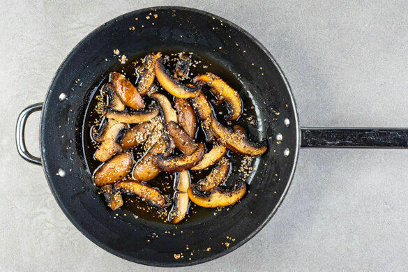 Die Pilze in einer großen Pfanne bei mittlerer Hitze in 5–7Min. goldbraun braten, dann aus der Pfanne nehmen und beiseitestellen.