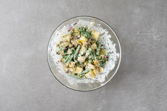 1½EL Mayonnaise und 2EL Senf mit 2EL hellem Essig und 1–2EL Wasser verrühren, dann die Zwiebeln, die Gurken und ca. ¾ der Petersilie untermengen und gut mit Salz und Pfeffer abschmecken. Die Kartoffeln und die grünen Bohnen untermengen und den Salat bis zum Servieren ziehen lassen.
