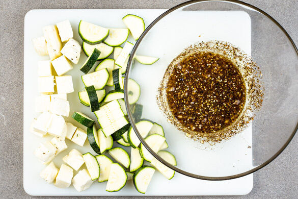 Den Knoblauch schälen, fein würfeln und mit dem restlichen Zitronensaft, der ½ der Gewürzmischung, 1EL Olivenöl und je 1 Prise Salz und Pfeffer verrühren. Den Grillkäse in 2–3cm große Würfel schneiden. Die Zucchini längs halbieren, dann quer in ca. 1cm breite Scheiben schneiden.