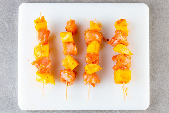 Die Mango- und die Hähnchenwürfel abwechselnd auf die Spieße ziehen.