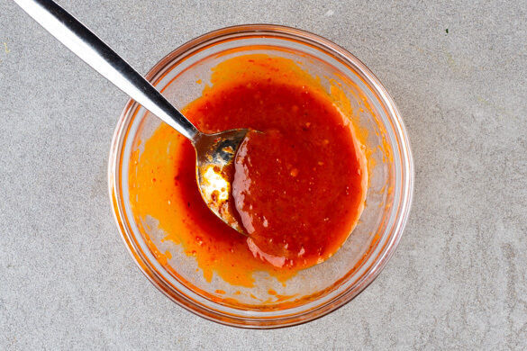 Falls verwendet, den Grill vorbereiten. Bei Verwendung von Holzspießen insgesamt 4 Spieße in in kaltem Wasser einweichen. Die ½ des Sambal Badjak oder mehr mit 1EL Pflanzenöl, ½EL Essig und 1 Prise Salz zu einer Würzsauce verrühren.
