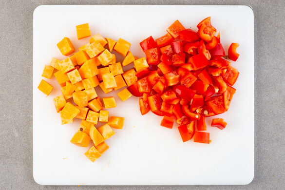 Den Backofen auf 200°C (180°C Umluft) vorheizen. Die Süßkartoffeln schälen und in 1–2cm große Würfel schneiden. Die Paprika vierteln, entkernen und ebenfalls in 1–2cm große Stücke schneiden. Das Brühgewürz in 700ml heißem Wasser auflösen.
