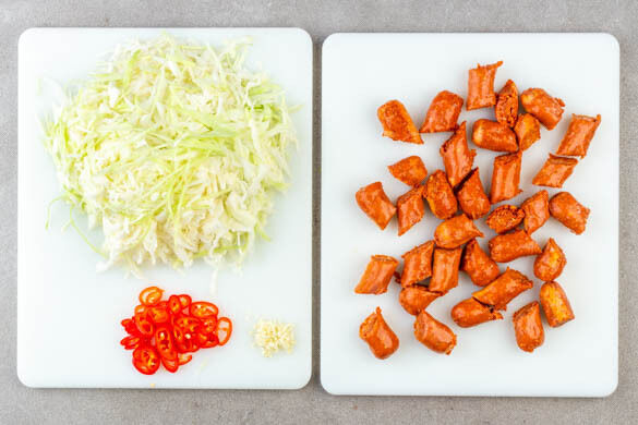 Die Kohle vierteln, vom Strunk befreien und in feine Streifen schneiden. Tipp: Falls vorhanden, einen Gemüsehobel verwenden. Den Knoblauch schälen und grob würfeln. Die Peperoni in feine Ringe schneiden. Die vegane Chorizo in ca. 3cm große Stücke schneiden.
