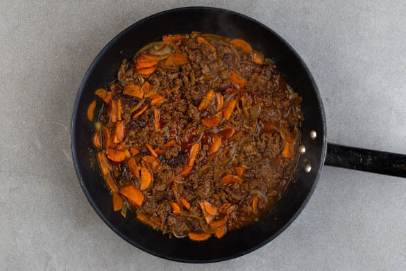 Die Pfanne mit dem Gemüse stark erhitzen. Sobald die Pfanne heiß ist, das Hackfleisch und ½TL Salz zugeben. Das Hackfleisch ca. 4Min. anbraten, bis es braun ist. Die BBQ-Sauce, die Gewürzmischung, 2EL hellen Essig und 300ml Wasser dazugeben und aufkochen. Anschließend bei niedriger Hitze 8–10Min. köcheln lassen.