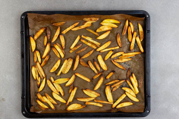 Inzwischen die Kartoffeln samt Schale in fingerdicke Stifte schneiden, mit 2EL Olivenöl und ½TL Salz vermengen und auf einem mit Backpapier ausgelegten Backblech verteilen. Die Pommes 20–25Min. im Ofen backen, bis sie goldbraun und knusprig sind.