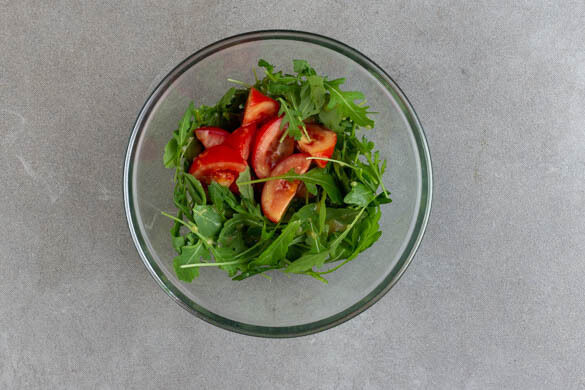 Inzwischen 2EL Olivenöl, 1EL hellen Essig, 1TL Senf und 1 kräftige Prise Zucker zu einem Dressing verrühren. Mit Salz und Pfeffer abschmecken. Die Tomaten in ca. 1cm breite Spalten schneiden, dann mit dem Rucola und dem Dressing vermengen.