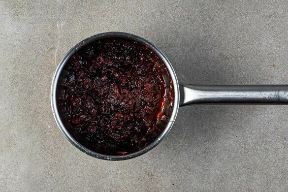 Die Zwiebeln in einem kleinen Topf mit 2EL Olivenöl und eine kräftige Prise Salz bei mittlerer Hitze 1–2Min. glasig andünsten. Die Cranberrys, 1EL Zucker, 1EL Essig und 300ml Wasser hinzufügen und ca. 15Min. köcheln lassen, bis der Dip eingedickt ist. Mit einem Stabmixer grob pürieren.