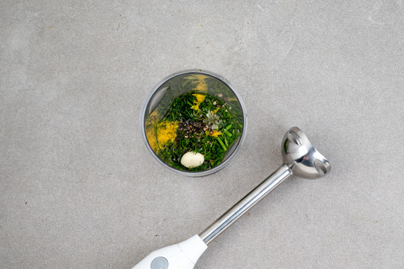 Den Dill, die Zitronenschale und den Knoblauch mit 2EL Olivenöl und 2EL Wasser in einem hohen Gefäß möglichst fein pürieren. Das Pesto mit Salz und Pfeffer abschmecken.