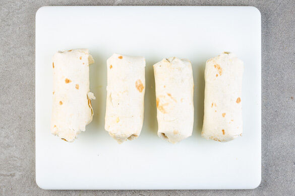 Die Hackfleischfüllung auf die Tortillas verteilen, den Käse darüberstreuen, dann die Tortillas rechts und links über die Füllung klappen und fest aufrollen. Die Pfanne auswischen.