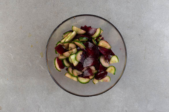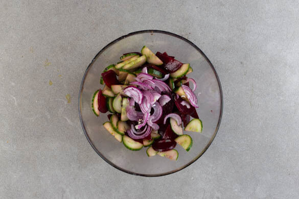 2EL Olivenöl, 2EL Balsamicoessig und je ½TL Salz und Pfeffer verrühren. Die Gurke längs halbieren und quer in dünne Scheiben schneiden. Die Rote Bete ebenfalls halbieren und in dünne Scheiben schneiden. Das Gemüse mit dem Dressing vermengen. Tipp: Da Rote Bete stark färbt, beim Verarbeiten am besten Küchenhandschuhe und Schürze tragen.