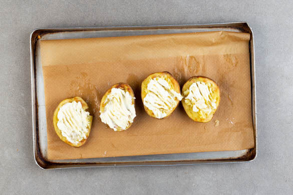 Den Backofen auf 220°C (200°C Umluft) vorheizen. Die Süßkartoffeln samt Schale längs halbieren und einige Male mit einer Gabel einstechen. Mit 2EL Olivenöl und 1 kräftigen Prise Salz einreiben und mit der Schnittfläche nach oben auf ein mit Backpapier ausgelegtes Backblech geben. Im ggf. noch vorheizenden Ofen 30-35Min. backen, bis die Süßkartoffeln gar sind.