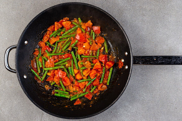 Die Tomaten und die Bohnen in einer großen Pfanne mit 4EL Olivenöl bei mittlerer bis starker Hitze 7–9Min. braten, dabei die Tomaten mit einem Kochlöffel leicht zerdrücken. Den Knoblauch schälen und fein würfeln, unter das Gemüse rühren und weitere ca. 2Min. mitbraten.