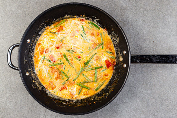Das Gemüse in der Pfanne mit ca. 75ml Pastawasser ablöschen und mit der ½ des Brühgewürzes bei starker Hitze aufkochen. Die Temperatur reduzieren, die Crème fraîche bei mittlerer bis niedriger Hitze einrühren und erwärmen. Die Sauce mit Salz und Pfeffer abschmecken.