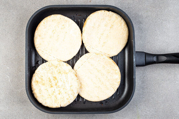 Inzwischen die Pitabrote mit insgesamt 1EL Olivenöl bepinseln. Wenn die Spieße fertig sind, die Brote auf dem Grill oder in der Grillpfanne auf jeder Seite ca. 1Min. erwärmen. Die Grillkäsespieße mit dem Tomaten-Gurken-Salat, dem Dip und dem Pitabrot servieren.