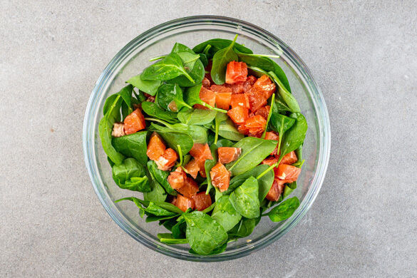 Den Spinat mit 1EL Olivenöl, 1EL Essig und je 1 Prise Salz und Pfeffer vermengen, dann die Orangenstücke mit dem Saft unterheben. Das Röstgemüse mit der Fetacreme und dem Salat anrichten und servieren.