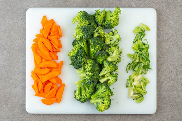 Die Lauchzwiebeln schräg in feine Ringe schneiden. Die Karotten ggf. schälen, längs halbieren und quer in dünne Scheiben schneiden. Den Brokkoli jeweils in mundgerechte Röschen schneiden, die unteren 1–2cm des Strunks abschneiden, den restlichen Strunk ggf. schälen und in dünne Scheiben schneiden.