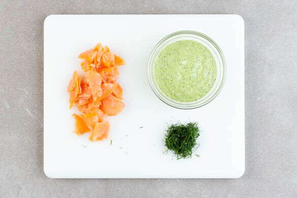 Die Kräuter samt Stängeln grob schneiden. Den Knoblauch schälen, halbieren und mit der Petersilie, ¾ des Dills, der ½ des Zitronensafts und 2EL Olivenöl ebenfalls in das hohe Gefäß geben und alles möglichst glatt pürieren. Löffelweise Wasser zufügen, falls das Pesto zu dickflüssig ist. Den Lachs in Streifen schneiden und mit dem restlichen Zitronensaft beträufeln.