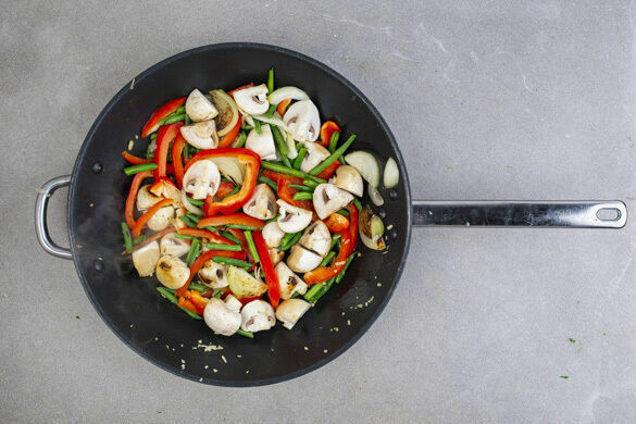 Die Zwiebeln, die Bohnen, die Paprika und die Pilze in einem Wok oder einer großen Pfanne mit 2EL Pflanzenöl bei mittlerer Hitze in 5–7Min. bissfest anbraten. Während der letzten 1–2Min. die Knoblauch-Ingwer-Paste unterrühren und mitbraten.