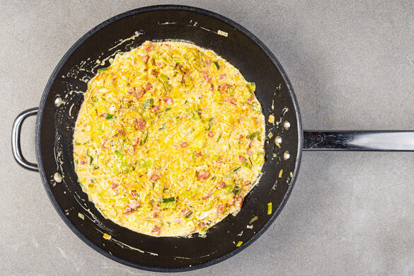 Den Lauch in einer großen Pfanne mit 1TL Olivenöl bei mittlerer bis starker Hitze 2–3Min. anbraten. Die Chorizo dazugeben und 1–2Min. weiterbraten, bis der Lauch weich und die Chorizo goldbraun ist.