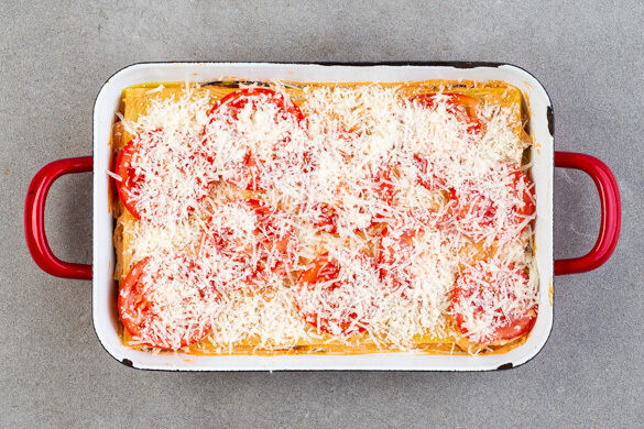 Die Lasagne nach dem Backen 5Min. ruhen lassen, dann in Stücke schneiden, auf Tellern anrichten und servieren.