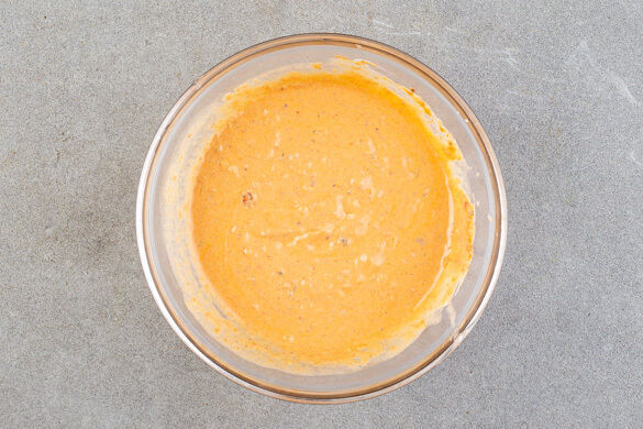 Die Crème fraîche mit dem Pesto und 4EL Wasser verrühren. Mit Salz und Pfeffer abschmecken.