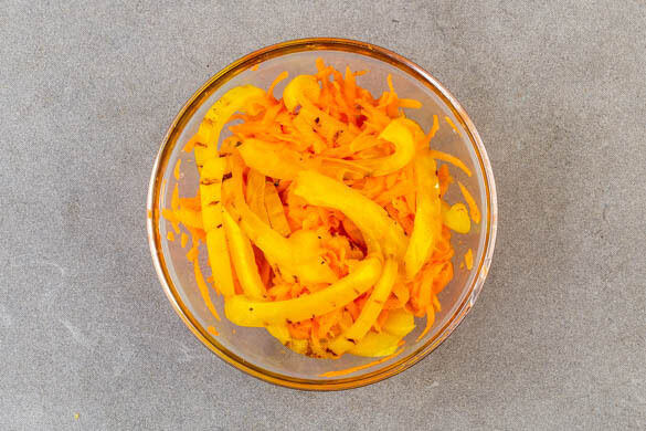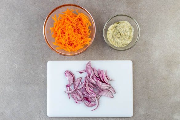 Die Karotte ggf. schälen, grob raspeln und mit 1EL hellem Essig, ½TL Honig oder Zucker sowie je 1 Prise Salz und Pfeffer vermengen. Die Zwiebel schälen, halbieren und in feine Streifen schneiden. 2EL Mayonnaise mit der ½ der Gewürzmischung und je 1 Prise Salz und Pfeffer zu einem Dip verrühren.