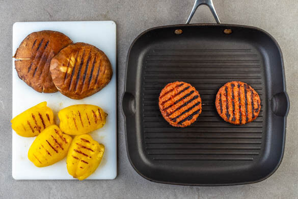 Die Paprika und die Pilze in der heißen Grillpfanne oder auf dem Grill auf jeder Seite 4–5Min. kräftig anrösten. Beiseitestellen. Die Pattys rundum mit 1TL Olivenöl bepinseln und in der Grillpfanne bzw. auf dem Grill auf jeder Seite 2–3Min. grillen.