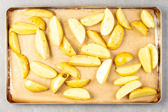 Den Backofen auf 220°C (200°C Umluft) vorheizen. Die Kartoffeln samt Schale in ca. 2cm breite Spalten schneiden, auf einem mit Backpapier ausgelegten Backblech mit 2EL Olivenöl sowie je 1 Prise Salz und Pfeffer vermengen und in 20–25Min. im Ofen goldbraun backen. Nach der Hälfte der Zeit das Blech um 180° drehen.