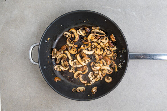 Die Champignons ggf. säubern, in dünne Scheiben schneiden und in der Pfanne mit 1EL Olivenöl bei mittlerer bis starker Hitze 6–8Min. braten, dabei möglichst nicht umrühren. Tipp: Wer mag, kann die Pilze auch in Butter anbraten. Den Knoblauch und den Thymian mit 1 Prise Salz hinzugeben und ca. 1Min. mitbraten. Die Walnüsse grob hacken.