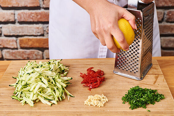 In einem großen Topf ausreichend gesalzenes Wasser für die Pasta zum Kochen bringen. Die Zucchini mit einer Küchenreibe grob raspeln. Die Peperoni in feine Würfel schneiden, für weniger Schärfe entkernen. Den Knoblauch schälen und fein würfeln. Die Petersilie samt Stängeln fein hacken. Die Zitronenschale abreiben.