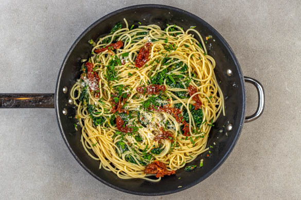 Die kleine in Öl eingelegte Sardelle kommt unserer Meinung nach viel zu selten auf den Tisch! Das war zumindest die einhellige Meinung in unserer Testküche, als wir dieses Express-Pasta-Wohlfühlgericht gekostet haben. Der feine Mittelmeerfisch veredelt hier die mediterrane Gemüsemischung aus geraspelter Zucchini, zartem Spinat und fruchtigen getrockneten Tomaten. Buon appetito!