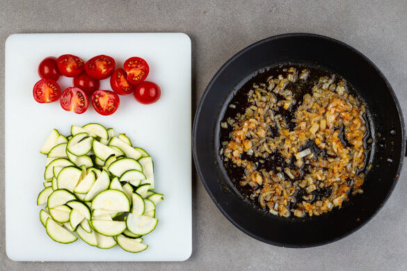 Die Zwiebeln, den Knoblauch, die Zitronenschale und ½TL Chiliflocken in derselben Pfanne mit 4EL Butter bei mittlerer Hitze 3–4Min. anschwitzen. Vorsicht, die Chiliflocken sind sehr scharf, ggf. weniger nehmen oder weglassen. Die Kirschtomaten halbieren. Die Zucchini längs halbieren, dann quer in dünne Scheiben schneiden.
