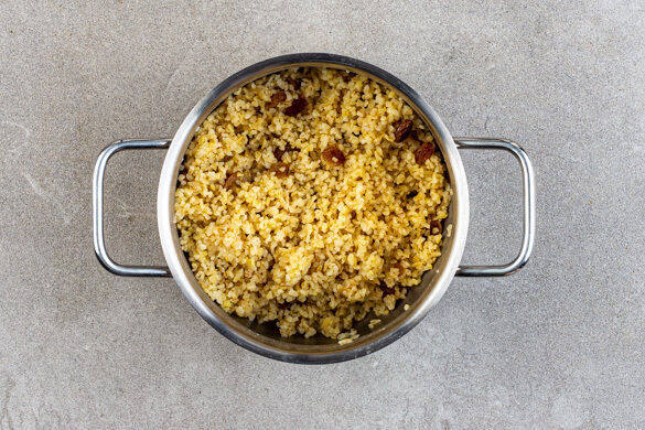 Den Bulgur in das kochende Wasser rühren und abgedeckt bei niedriger Hitze 5–7Min. sanft köcheln lassen, bis das Wasser aufgesaugt und der Bulgur gar ist. Die Rosinen unterheben und den Bulgur abgedeckt noch ca. 5Min. ohne Hitzezufuhr ziehen lassen.