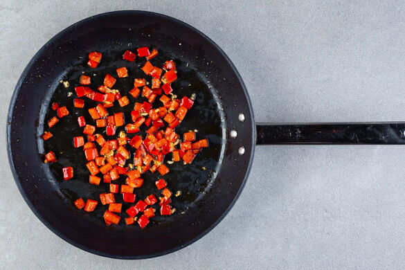 Die Paprika in einer großen Pfanne mit 2EL Olivenöl und 1TL Salz bei starker Hitze ca. 2Min. anbraten, dabei gelegentlich umrühren. Die Paprika bei mittlerer bis niedriger Hitze ca. 8Min. weiterbraten, in der letzten Minute den Knoblauch dazugeben und die Pfanne anschließend vom Herd nehmen.